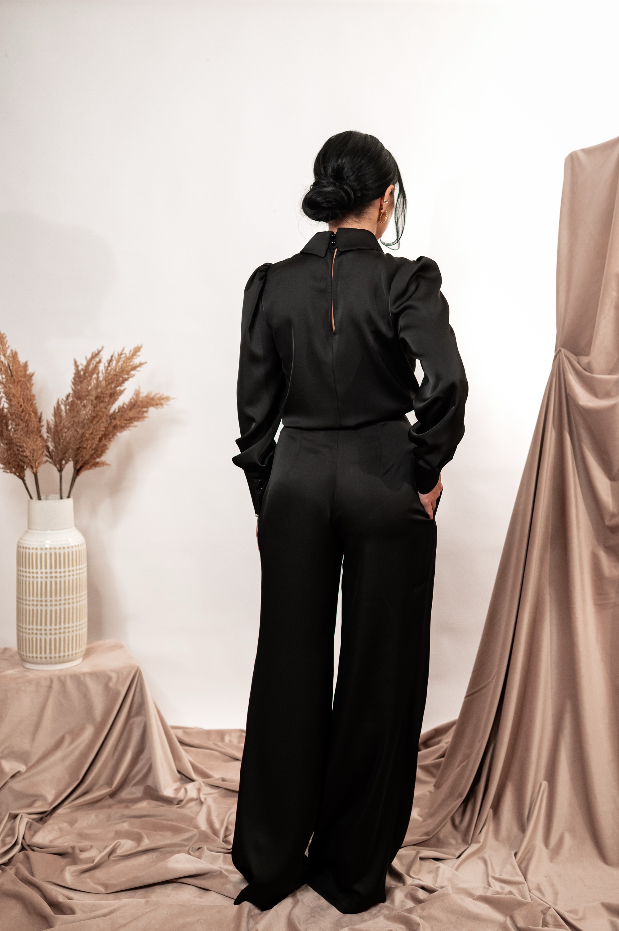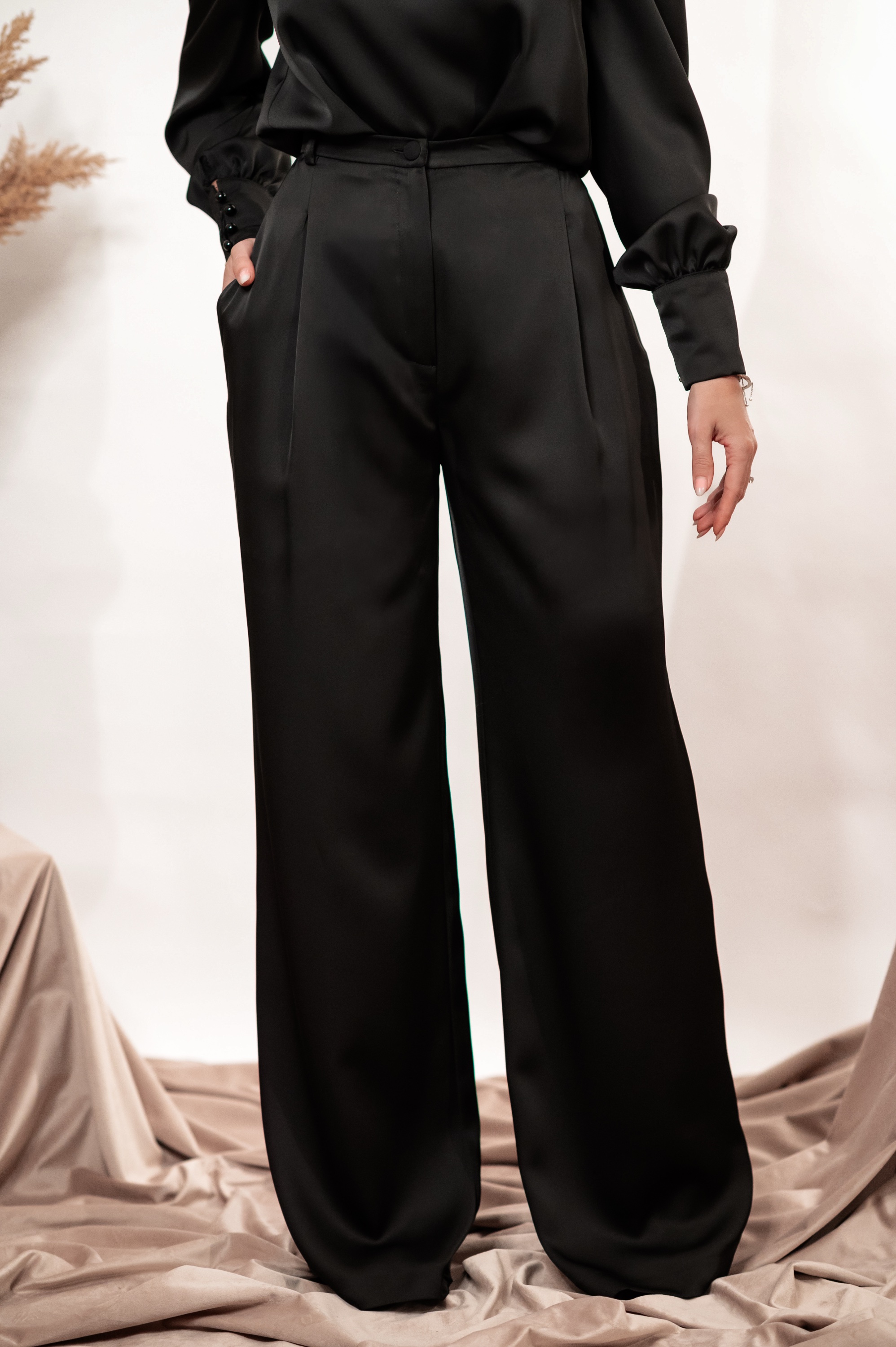 Pantaloni eleganți cu talie înaltă și croială largă, realizați din material premium cu cădere fluidă. Un model sofisticat, perfect pentru ținute elegante, office sau de seară.