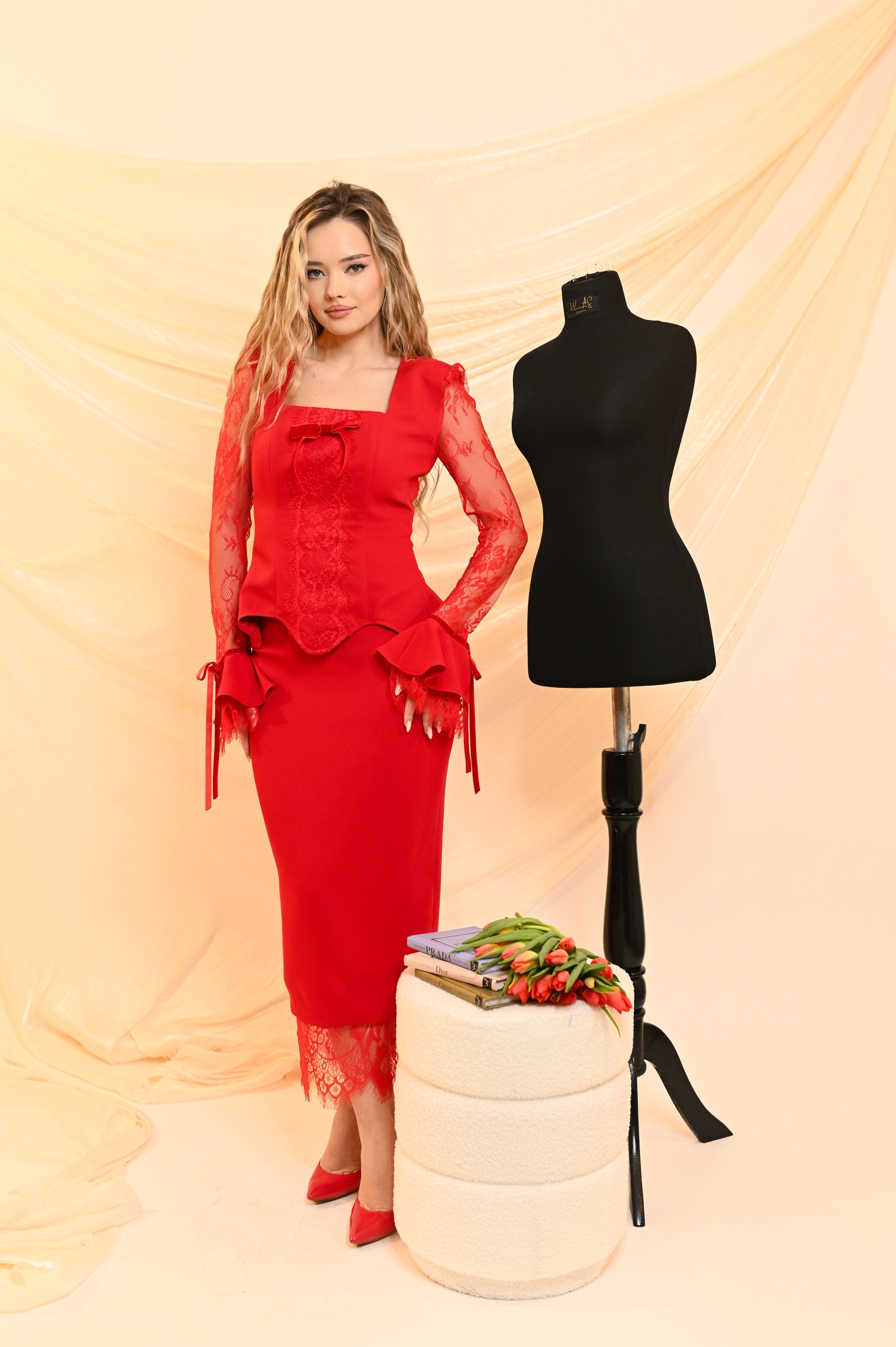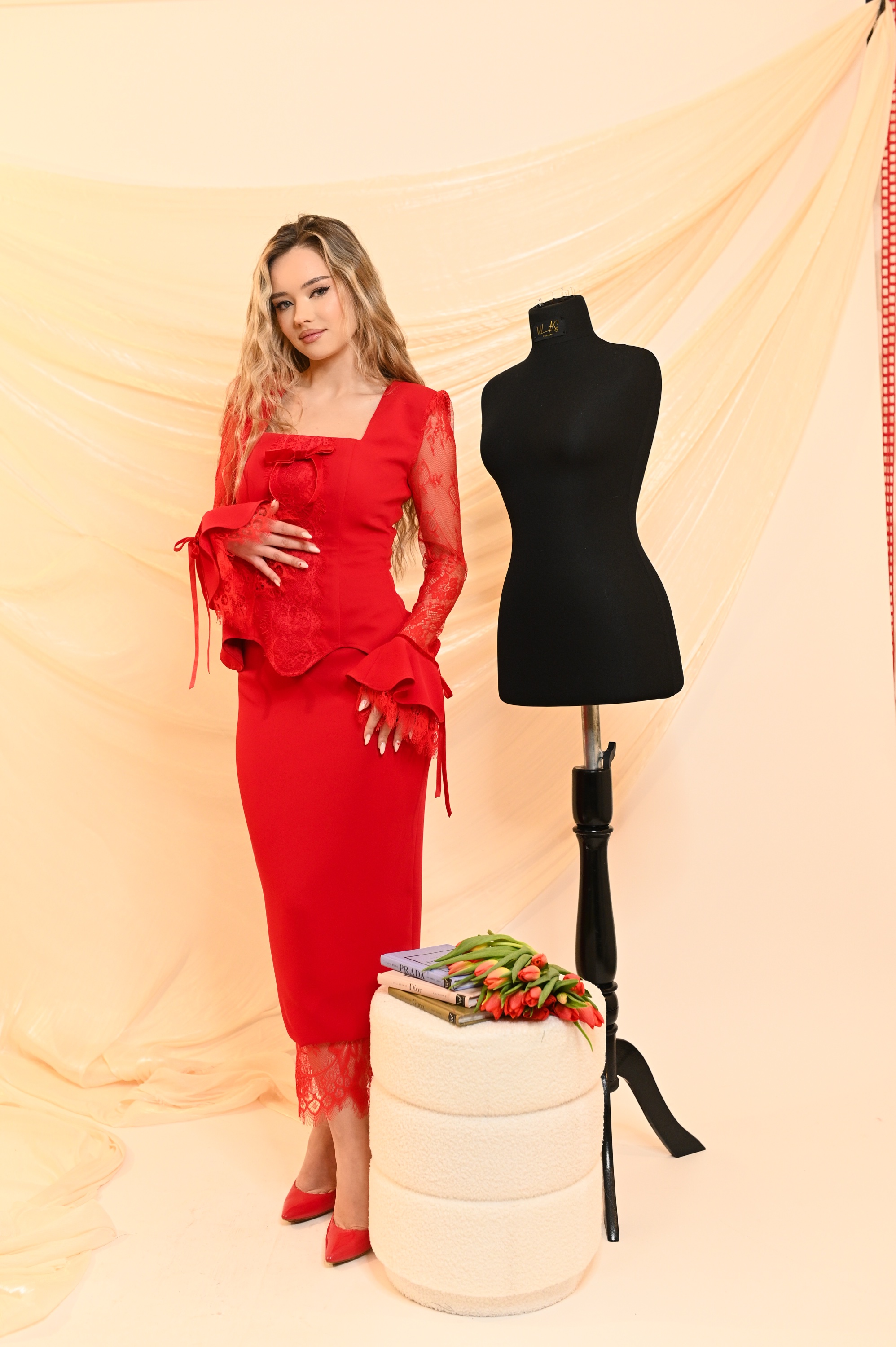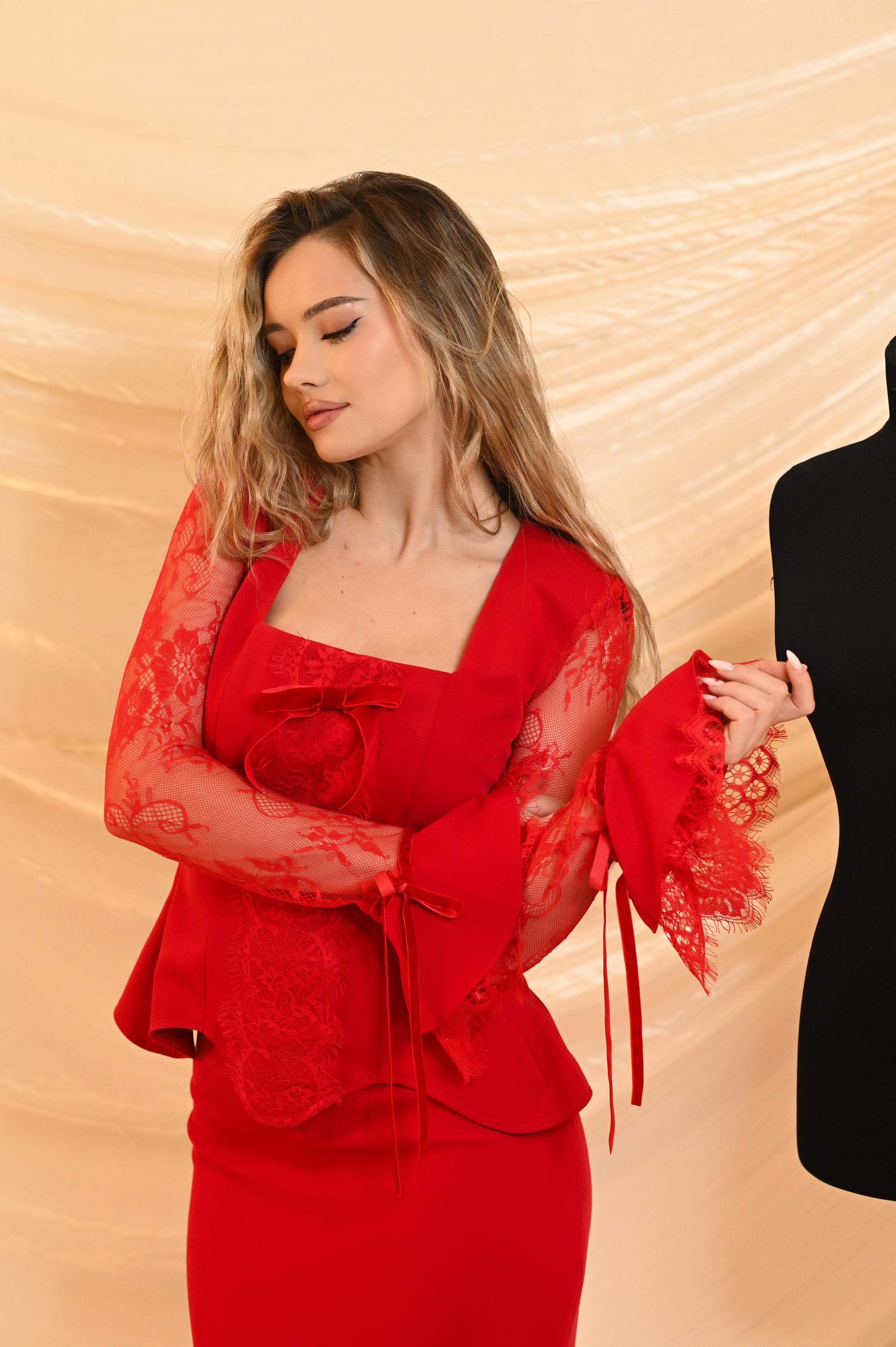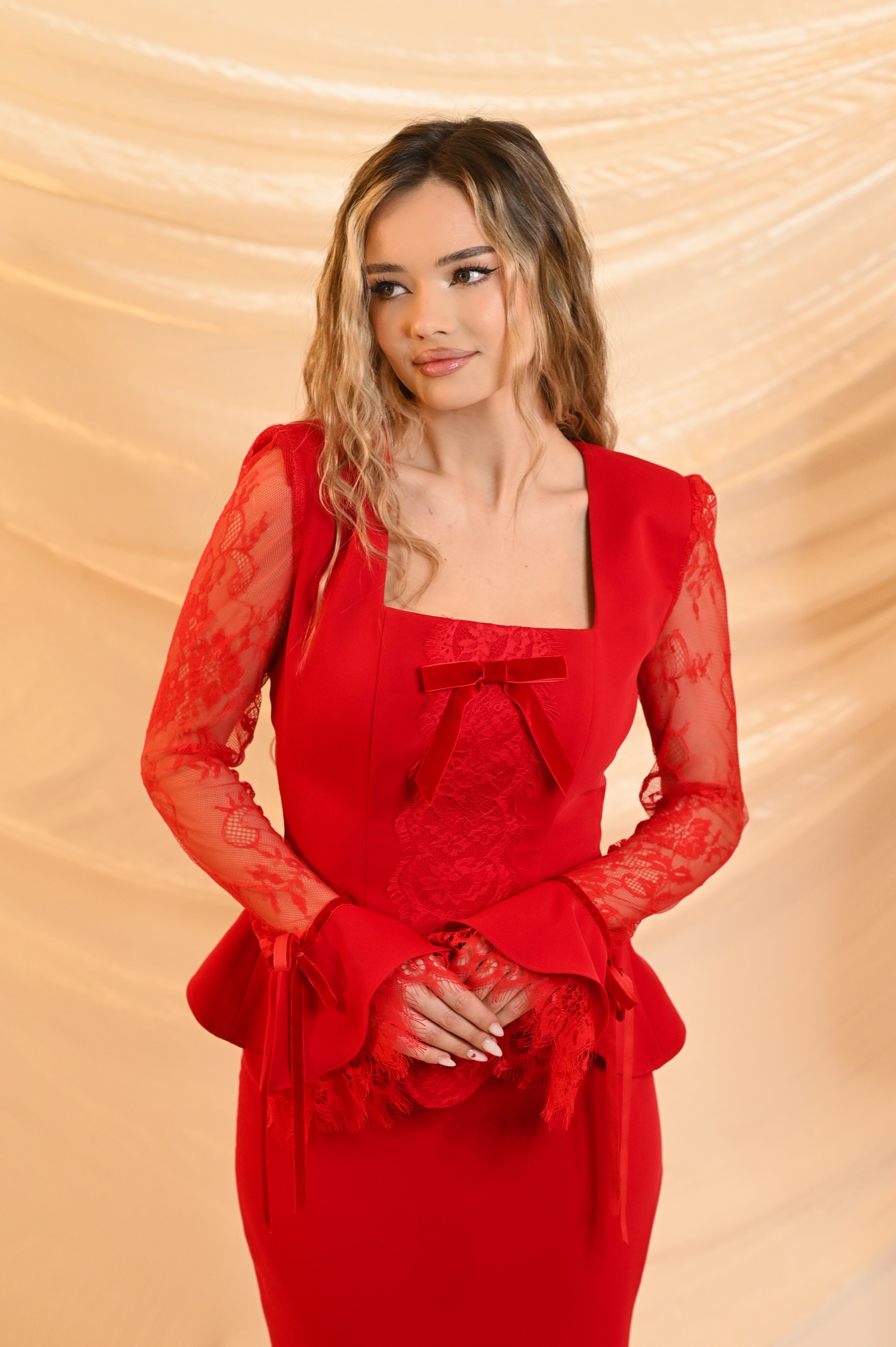 Bustul este pus în valoare prin inserție centrală din dantelă fină, completată de un detaliu delicat tip fundă, ce adaugă un aer romantic și rafinat. Mânecile lungi din dantelă transparentă oferă un contrast subtil între senzualitate și eleganță, în timp ce terminațiile evazate ale manșetelor, decorate cu panglici fine, creează un efect couture spectaculos.