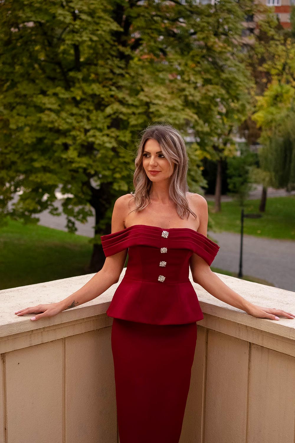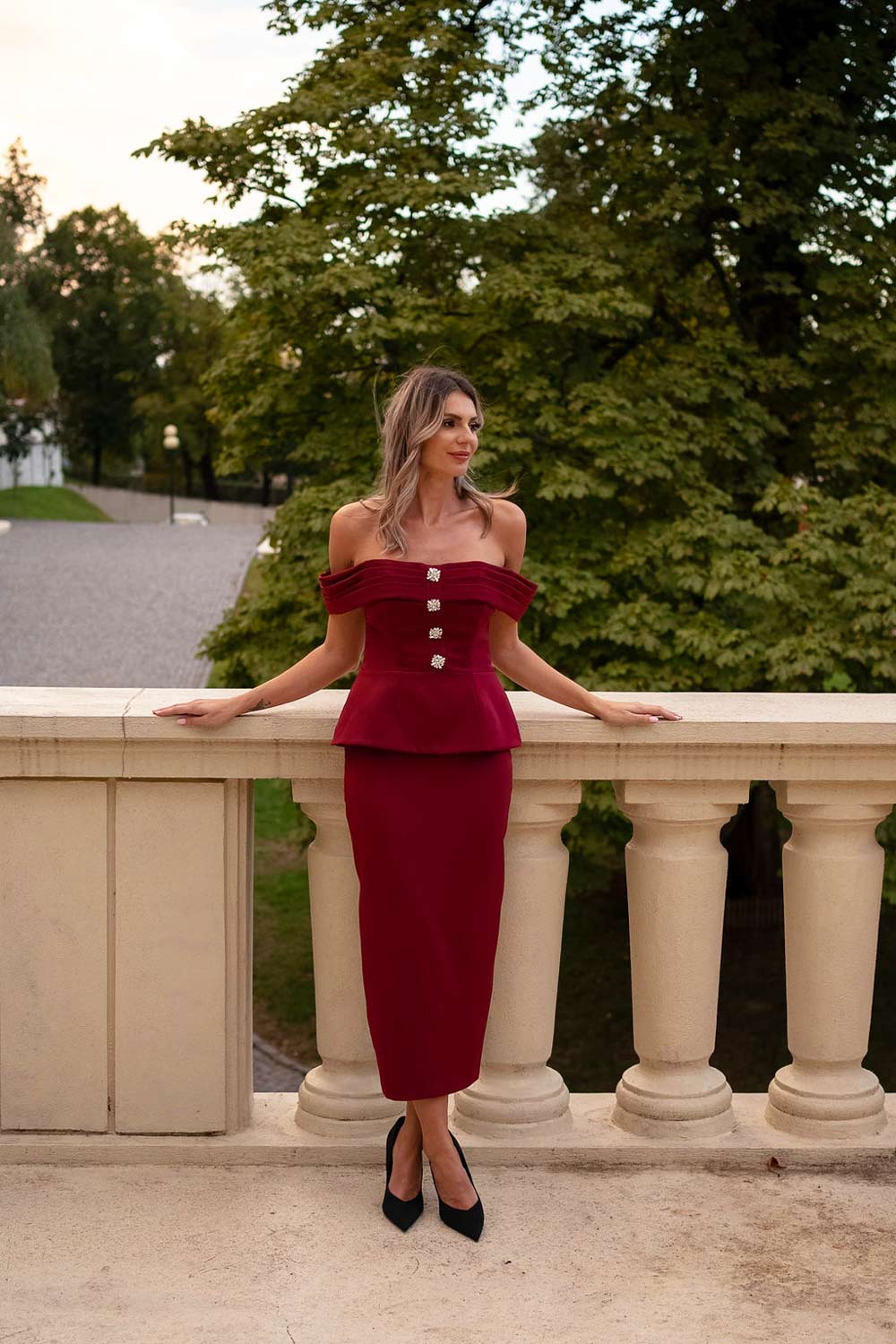 This elegant off-the-shoulder top in a deep red is the perfect statement piece for any sophisticated wardrobe. Featuring a flattering, structured design with a beautifully enhanced silhouette, it highlights the waist while providing a chic, feminine shape. The front is adorned with three embellished buttons, adding a touch of glamour and refinement. The back of the top is fitted with a zipper for a smooth, seamless finish. Ideal for formal occasions or evening events, this top pairs beautifully with a matching skirt or tailored trousers for a complete, polished look.