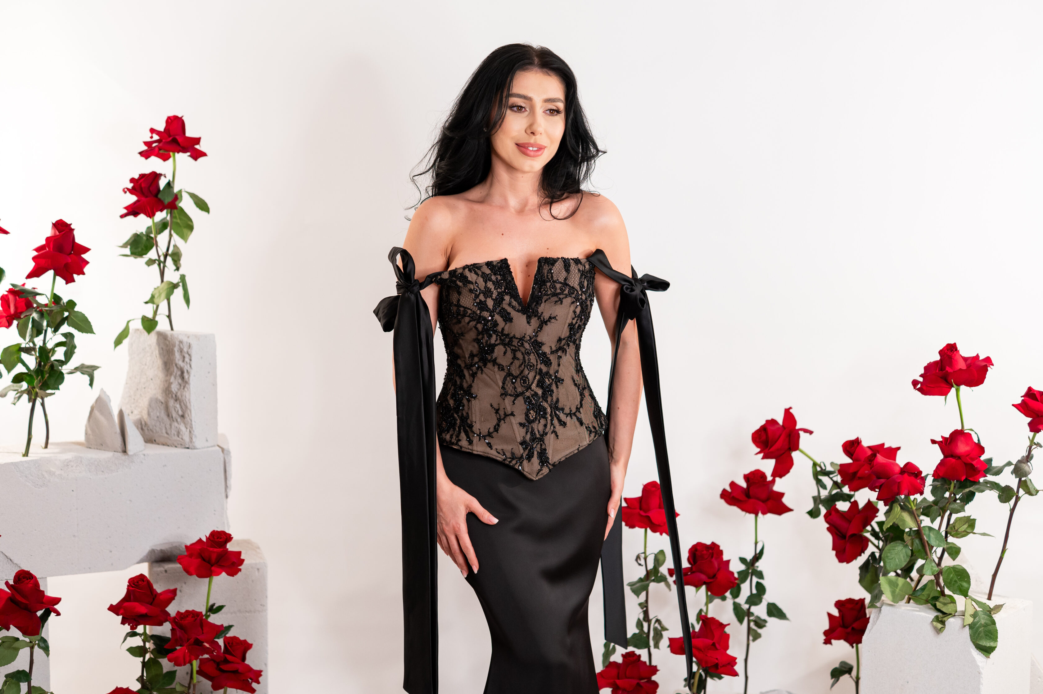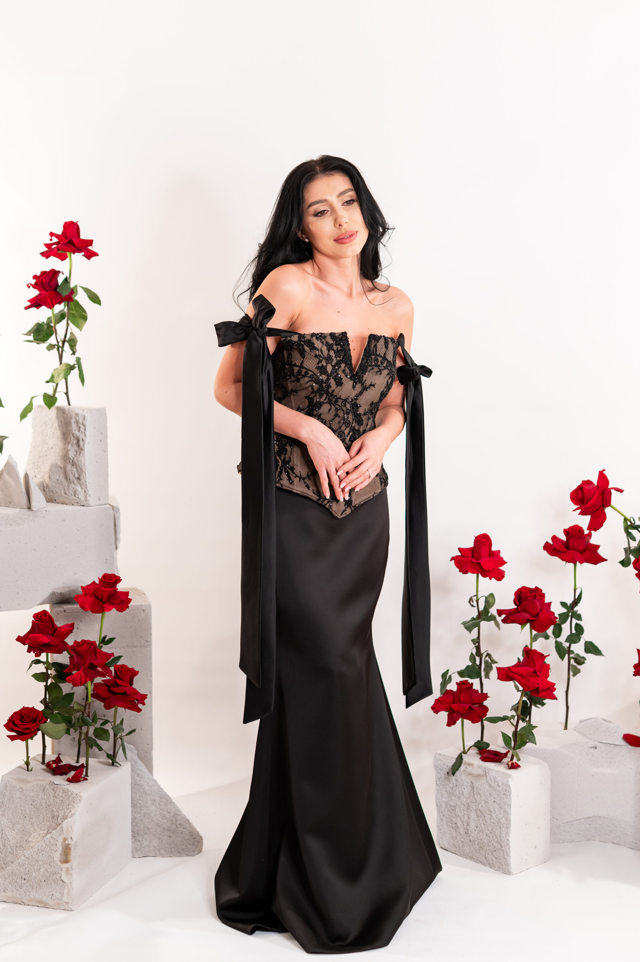 Complementing the corset, the dress transitions seamlessly into a sleek black siren skirt that hugs the hips and flares elegantly at the hem, emphasizing the natural curves and adding a touch of vintage glamour.