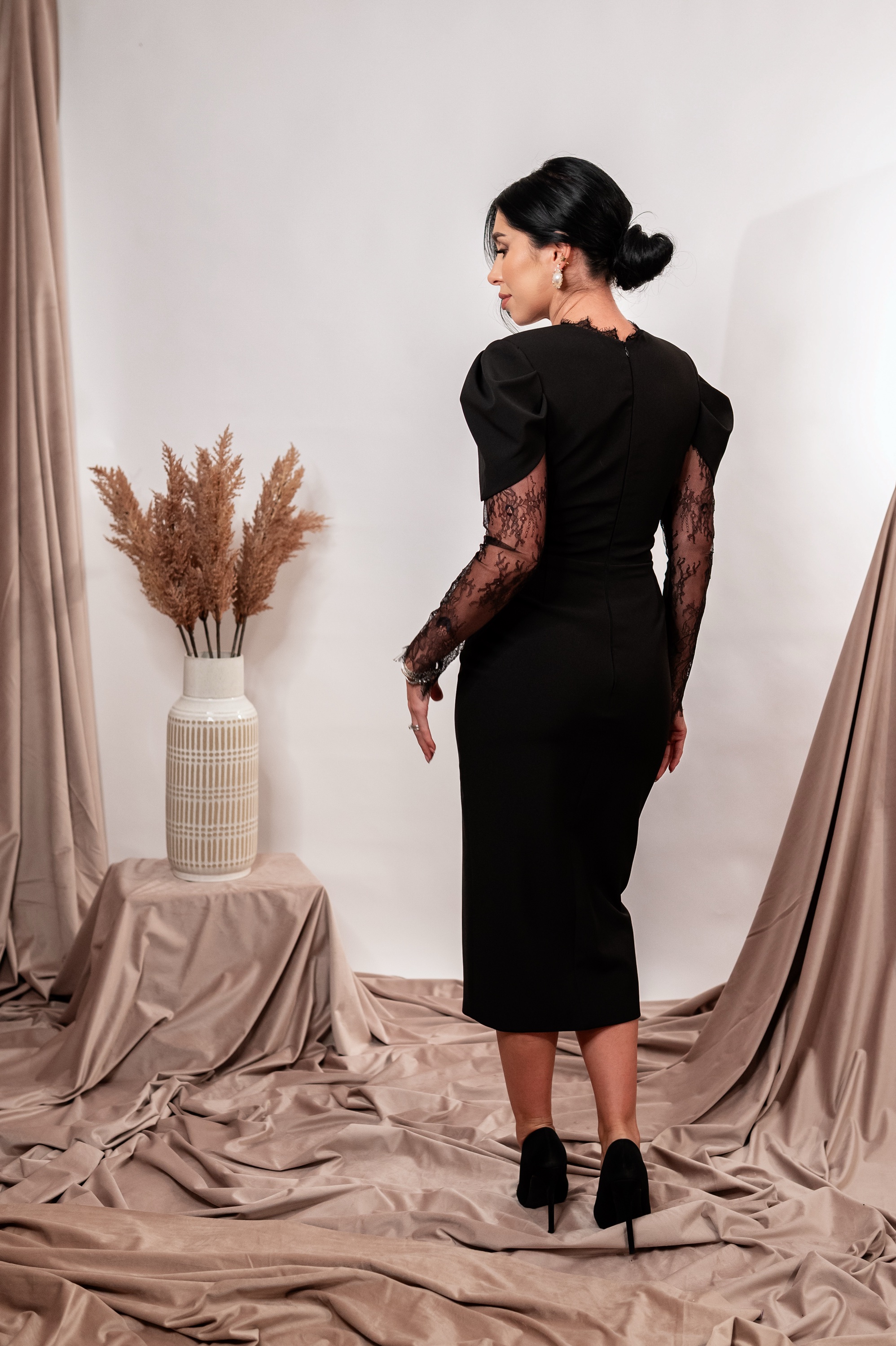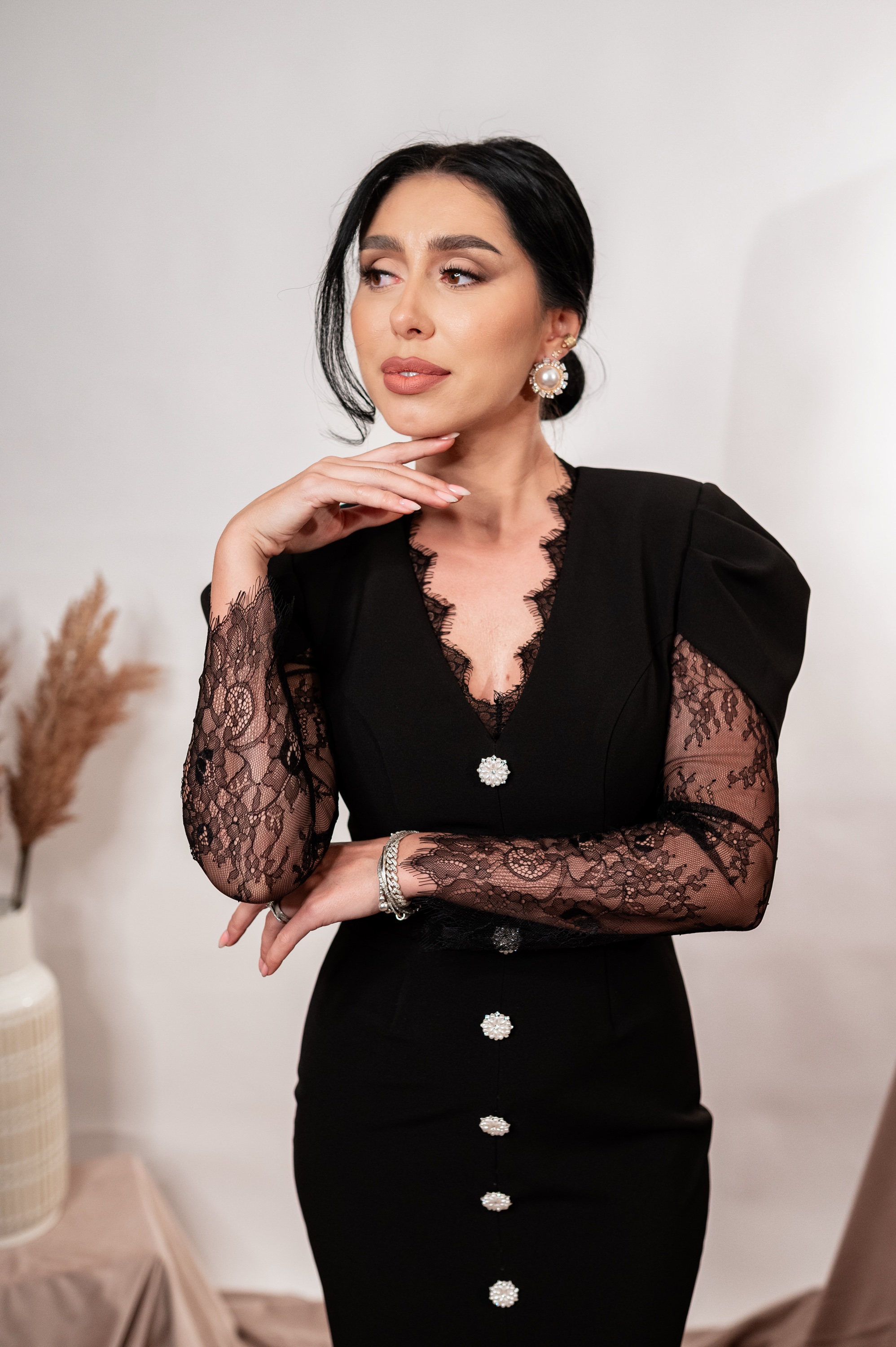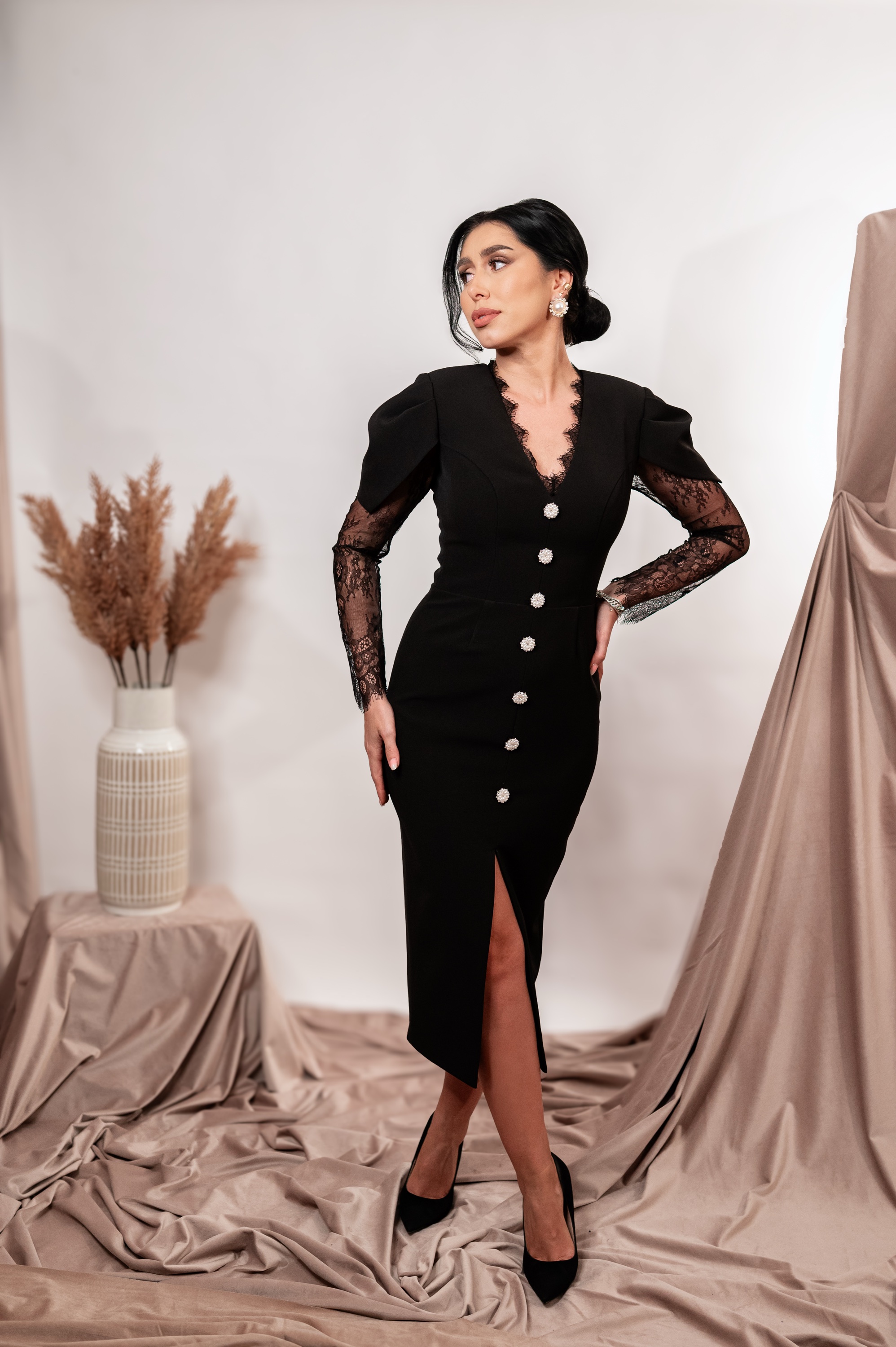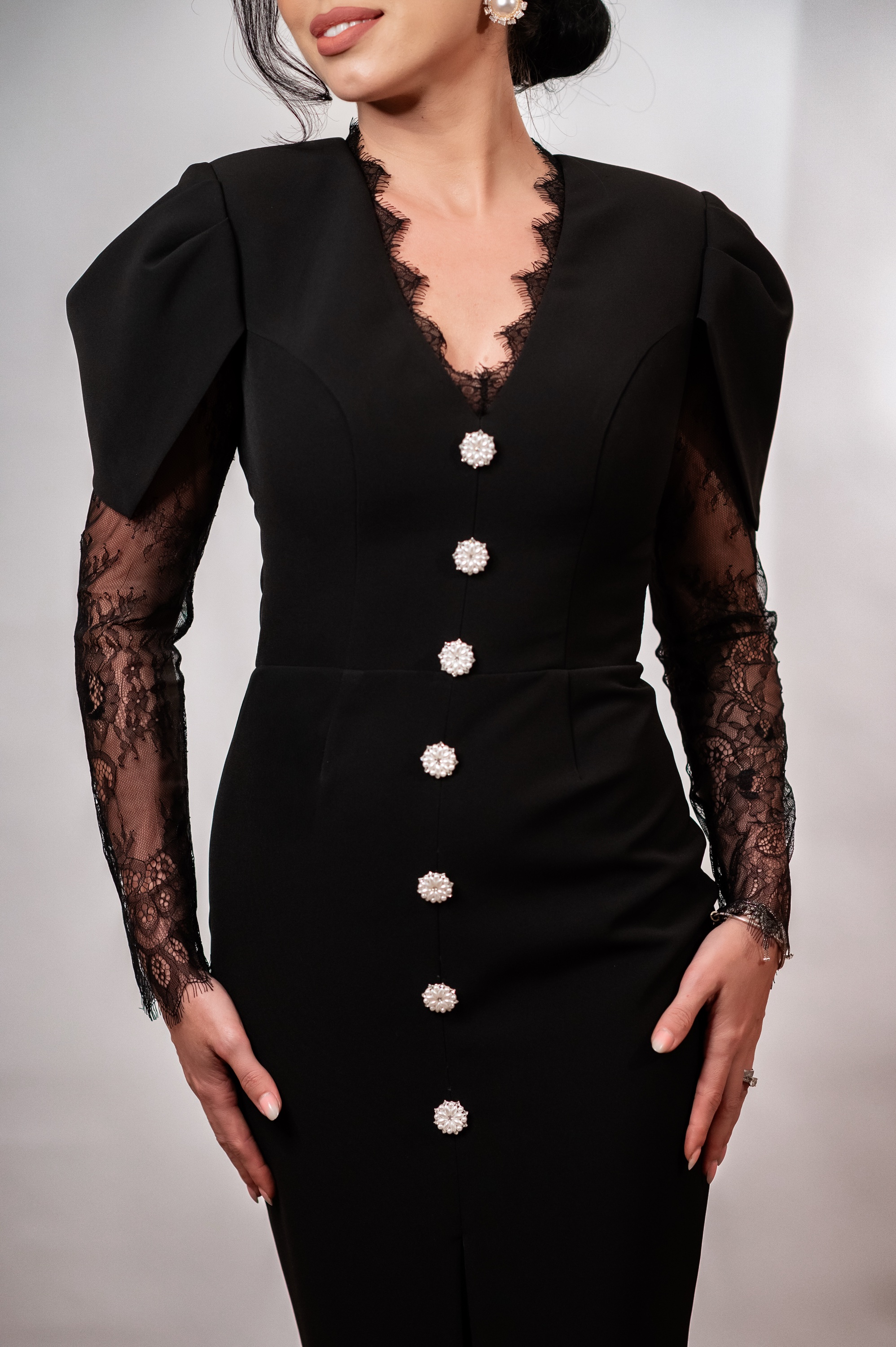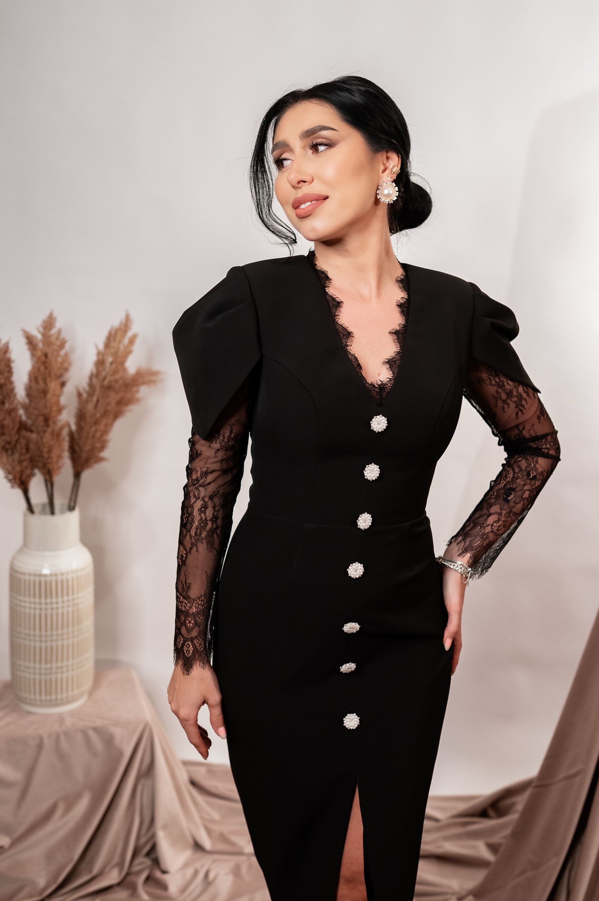 Rochia Donna este o piesă elegantă și ultra-feminină, creată pentru apariții memorabile. Confecționată din stofă fină, rochia îmbină mânecile din dantelă delicată cu umeri structurați pentru un efect sofisticat. Decolteul în V este conturat cu dantelă, iar linia centrală este decorată cu nasturi statement tip bijuterie. Croiul conic alungește silueta, iar slitul frontal oferă echilibrul perfect între rafinament și senzualitate. Ideală pentru evenimente, seri speciale sau momente în care vrei să fii impecabilă.