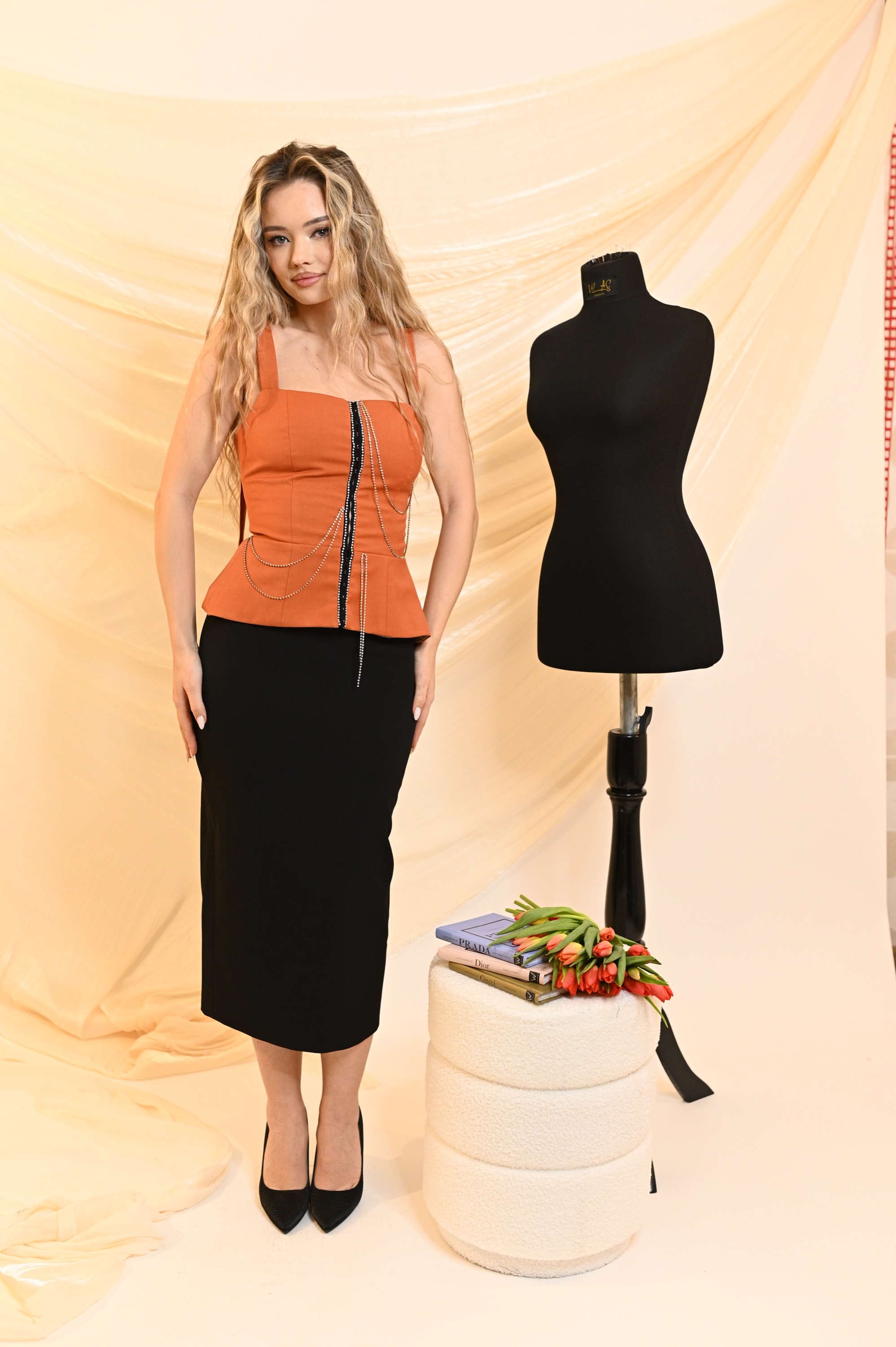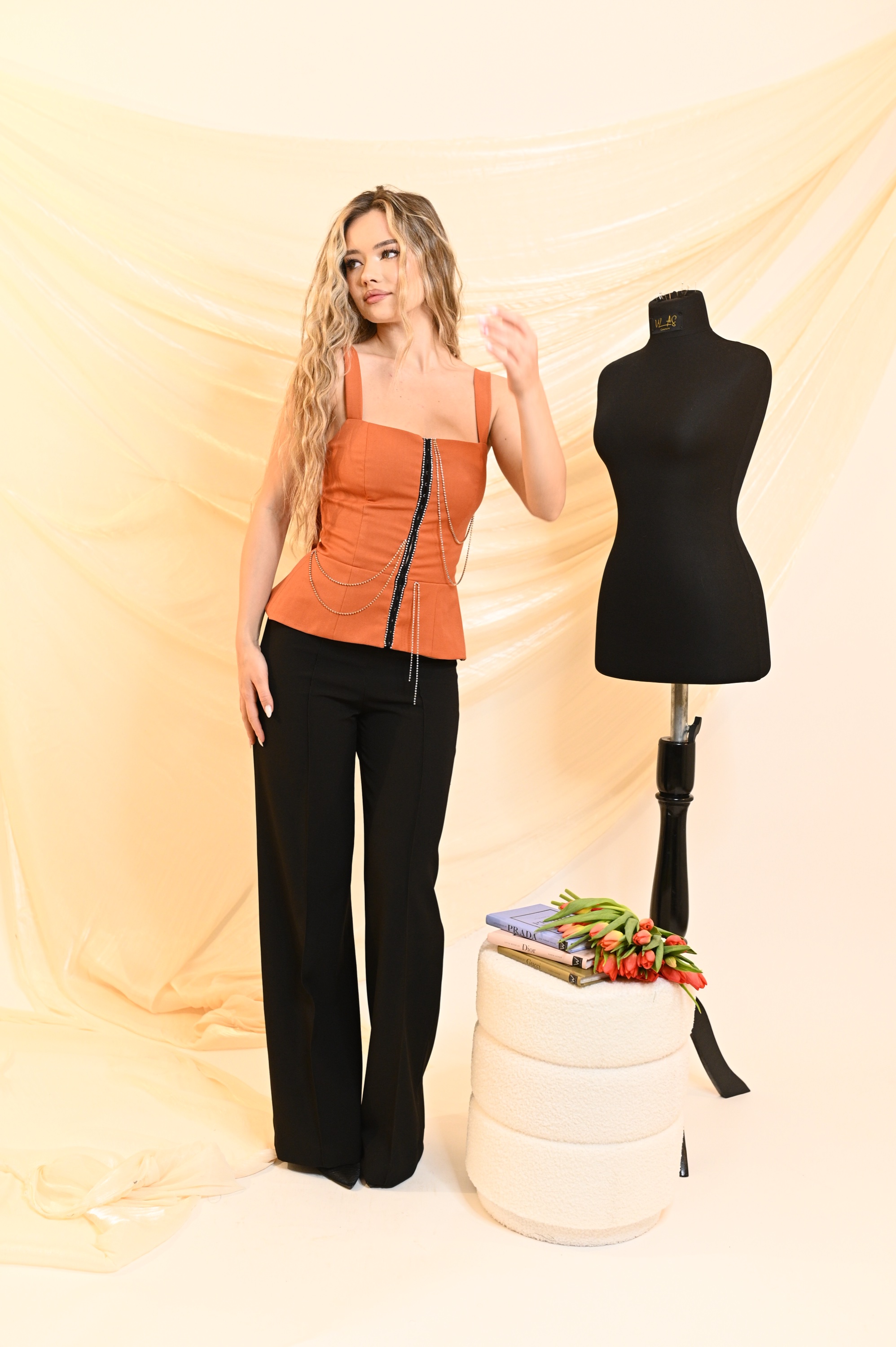 Topul tip corset, realizat din material premium cu ținută impecabilă, evidențiază talia și conturează armonios silueta. Aplicațiile metalice și lanțurile decorative aplicate manual adaugă un aer sofisticat și îndrăzneț, transformând piesa într-un element central al ținutei.