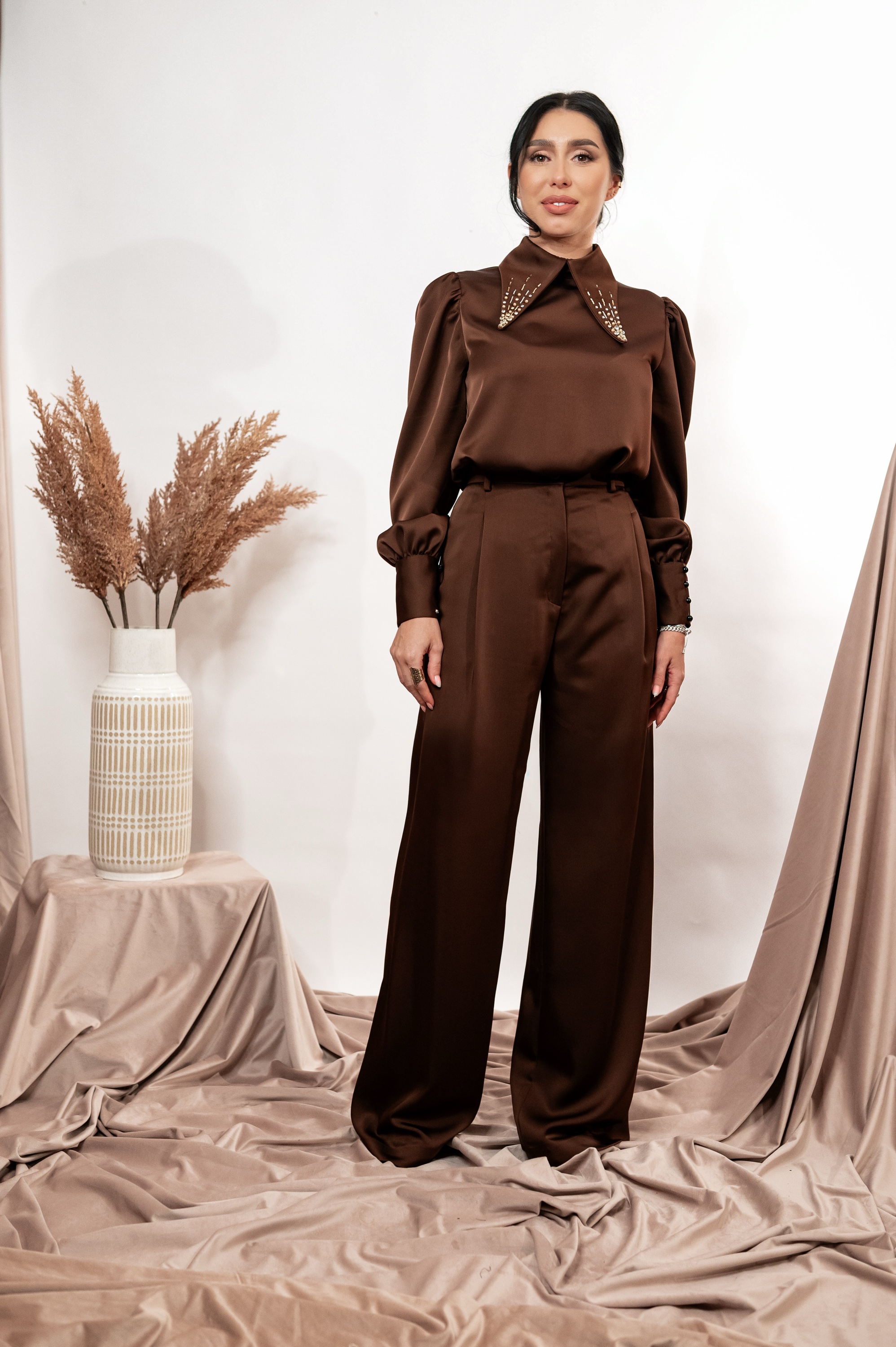 Pantalonii cu talie înaltă și croială largă completează perfect ansamblul, conturând o siluetă feminină și modernă.